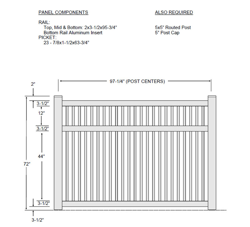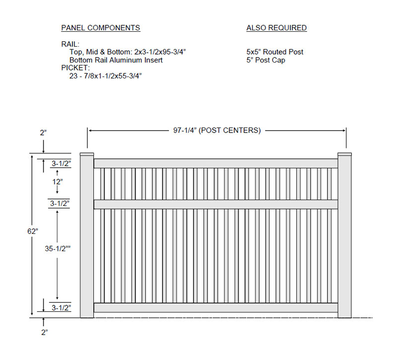 | Rail: | Top, Mid, & Bottom: 2×3-1/2×95-3/4″ Aluminum Bottom Rail Insert |