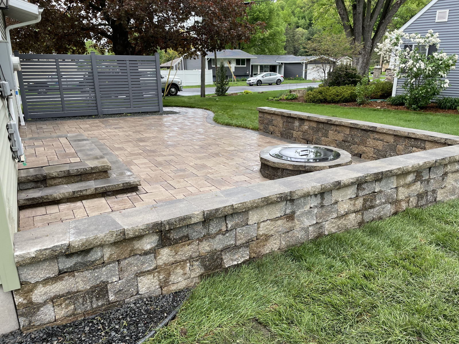 Patio: Westport in sierra. Patio frame Westport in charcoal. Estate wall: Westport in sierra with granite coping.